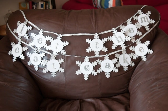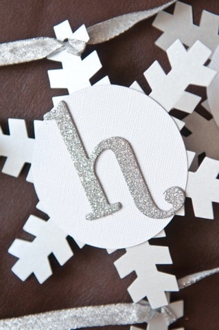 I used my favorite brand of adhesive, Zots, to attach the circles to the snowflakes, and used them again to attach the letters to the circle-snowflake combination. Once they were all done, I tied each snowflake onto a long piece of silver ribbon, making a loop around each flake to keep them from sliding.
