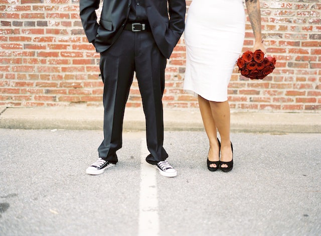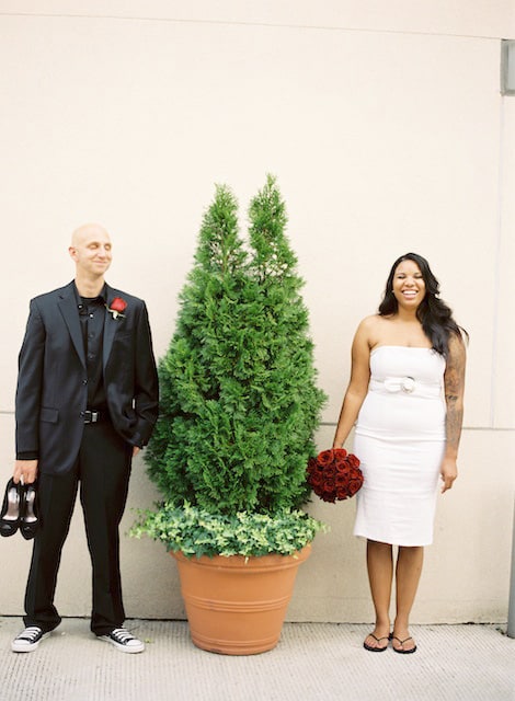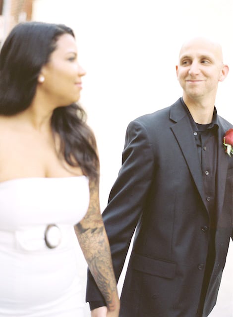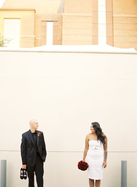 Amy threw the ideas of gowns out the window and opted for an adorable LWD (little white dress) instead. It perfectly fits her sense of style and even more so it perfectly compliments her man’s style as well. Behold, Amy with Sean in tow:
