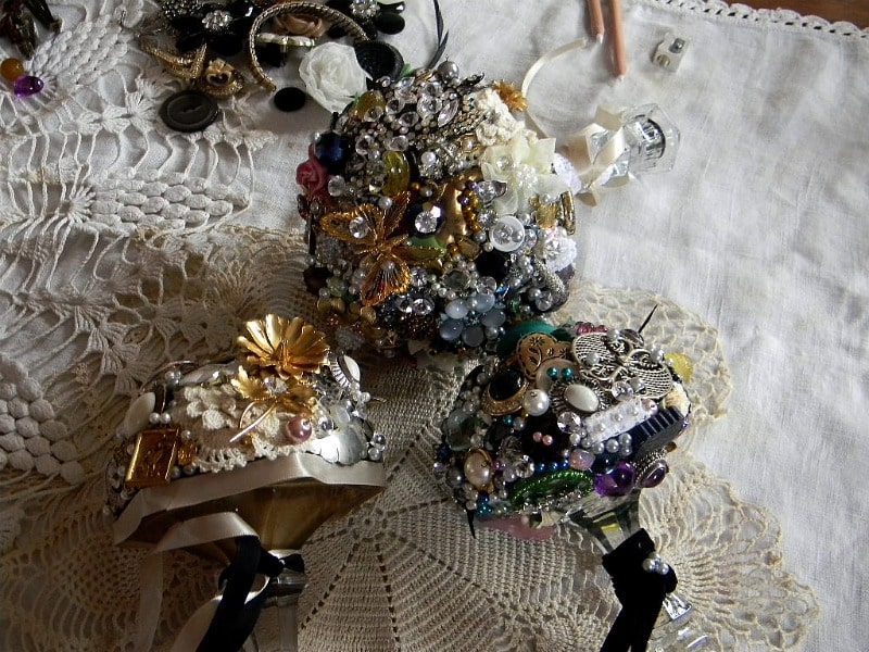 In addition to fresh flower arrangements, I have my version of the wonderful brooch bouquets – I have distinguished mine by constructing them with stands made from candle holders, vases, etc. They are carried just like a bouquet, and then can be stood up, a feature I quite like, and has been popular with brides. I have also sold them for anniversary gifts, etc.