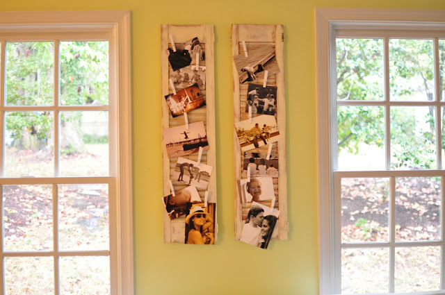 Oooh!!! Love this ~ photo display using clothespins and old shudders!! [via Our Sweet Story]