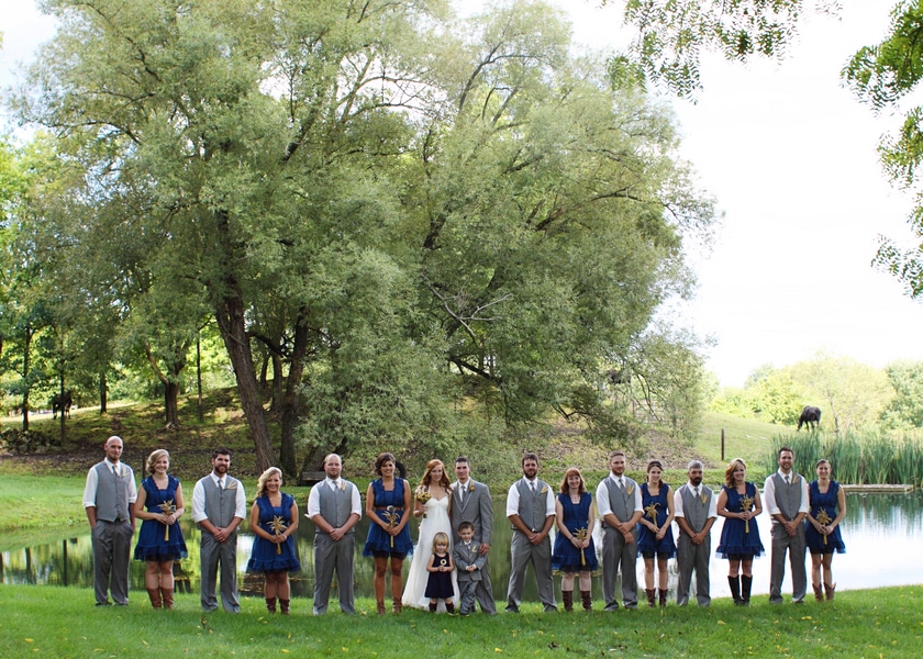 The theme of “country” rang true through every aspect of their wedding; from the mason jars that everyone drank out of to the wedding cake topper featuring pheasants. Nearly everyone, wedding party and guests included, wore boots to the occasion. It was a perfectly tasteful way to do the country theme.