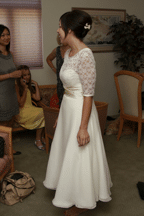 My MIL and I met 4 times throughout the course of the DIY wedding dress project. The very first time she had basically used what she could from the pattern and my pictures and I had a very lose outline of the dress [held together by pins!] we had to make some SERIOUS adjustments … The second time had just pins again – but she had made the adjustments and things were looking much better. We fit it better around my arms & a few other places and then it was ready to be sewn [! eep!]. The third time it was sewn together – and felt like a REAL dress! It still needed some help around the arms and needed to be hemmed, this felt more like a traditional fitting. The last time was in June when I got the email that “YOUR DRESS IS READY!!!”