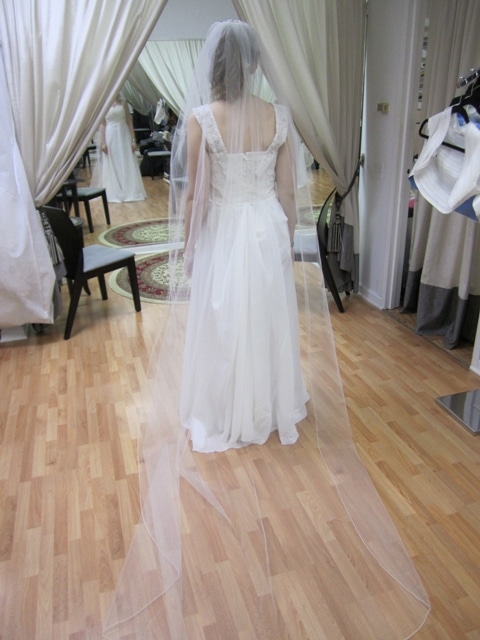 One of the more final rounds of the wedding dress transformation, from the back and with her veil in!