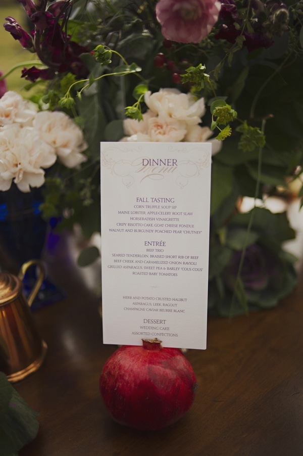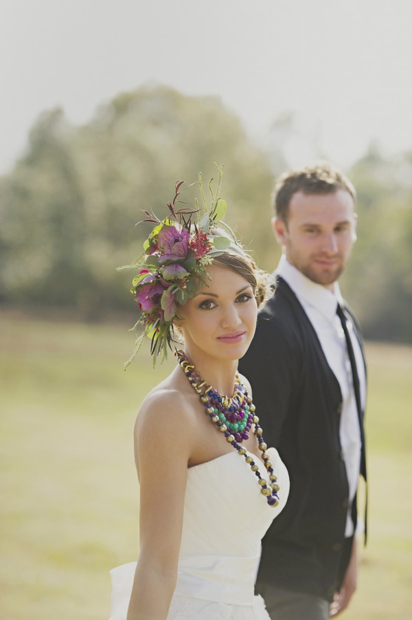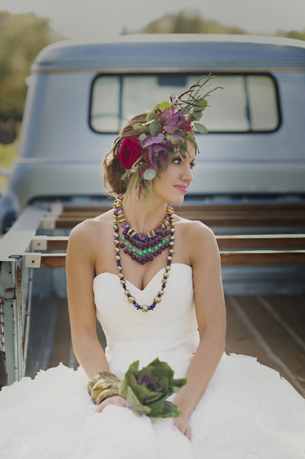 Not only are the models stunning – but every element of this bohemian wedding shoot is just styled to the most microscopic detail. The overflowing floral headpiece, the chunkiest display of a statement necklace I have ever seen, the pomegranate seating card holders … and more … oh, SO much more.
