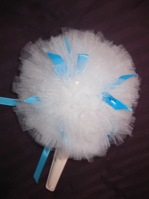 We wrapped the stand with white ribbon and glued it in place and then wove in the ribbon around the edge and let the tails hang down. The rest of the bridal party will be teal, although we haven’t been able to find teal tulle that is the right color and right price yet.