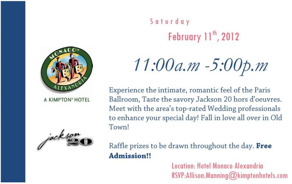 Kimpton’s Monaco Alexandria is hosting a Free Wedding Open House to brides on Saturday, February 11, 2012 from 11:00 AM to 5:00 PM !!