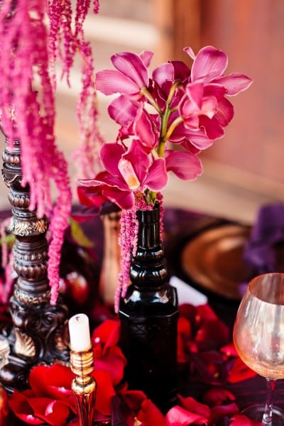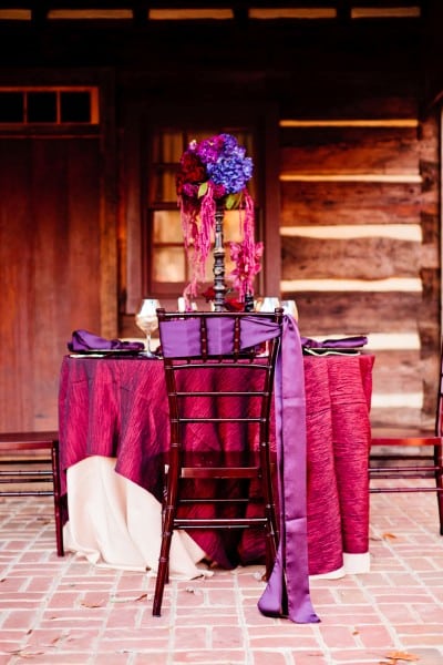 With pirates, vampires and real-life Cinderella stories [The Royal Wedding] being common themes in our current pop culture, brides want to shine on their wedding day as the star of their very own theatrical fairy tale. Inspired by this, C&A Events and Anthomanic came up with the theme of Royal-Gothic-Pirate-Feast. This dramatic, jewel-tone rich tablescape really set the mood for an intimate & romantic gathering. The very regal, soft and rich palette of textures and colors juxtaposed by the reclaimed wood of the cabin porch at the beautiful wedding venue, Stevenson Ridge, has a unique feel taking guests back in time.