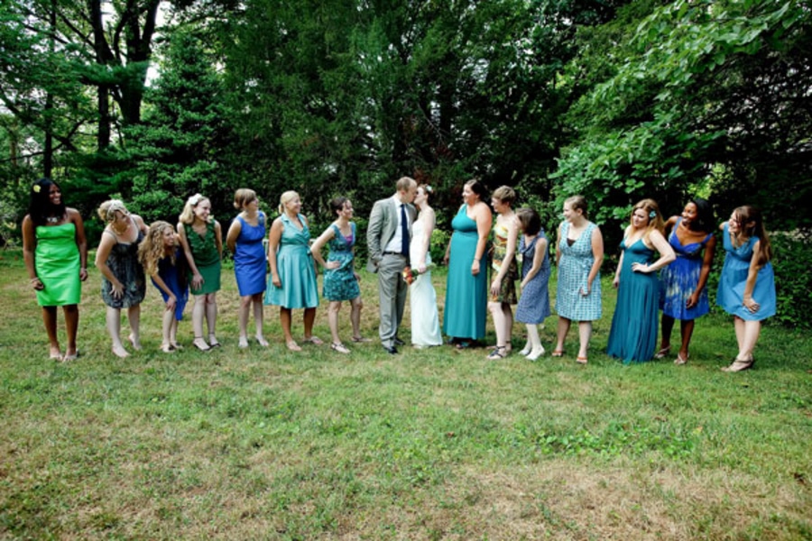 AND the mismatched bridesmaids [of course] … all 14 of them in shades of blue & green!