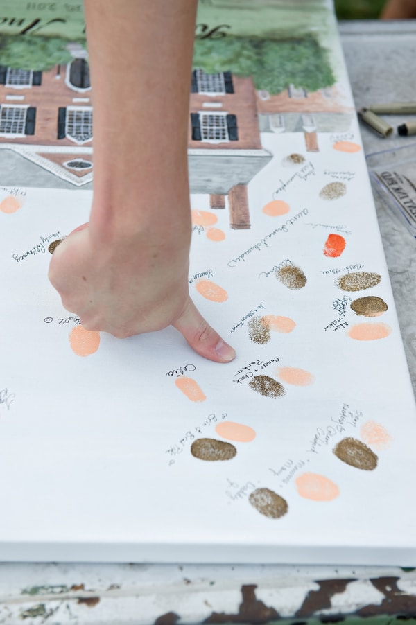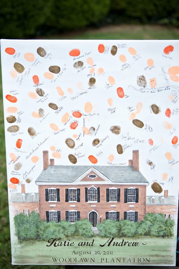 My Grandma painted a picture of Woodlawn House [the wedding venue] and then everyone put thumbprints/names around the picture. My Grandma then finished off the prints to make them look like balloons coming from the house