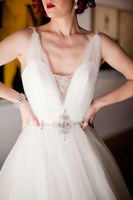 What did you think of our vintage bride? Can you decide on your favorite part of the look ~ the pin curls wedding hairstyle? The bright red lips? The vintage feather fascinator? Or the intricate lace & tulle vintage wedding dress?