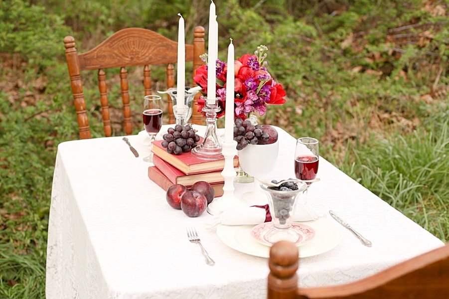 This styled shoot is fun, whimsical, and themed around fruit and rich jewel tones. The setting, Grey Gables Farm, is the perfect backdrop with rollings hills and misty morning light. The look of this shoot can easily translate into a summer or fall wedding!