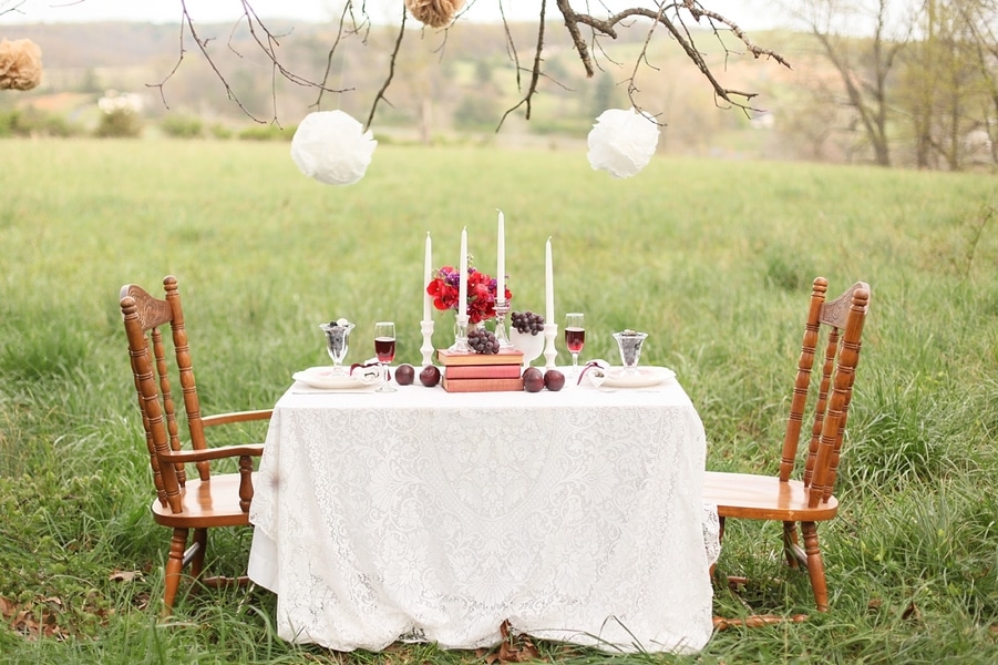 This beautiful bridal shoot features lush colors of grape purple, royal red, khaki, and white! The decorations were entirely DIY & budget-friendly with paper pom poms adorning the trees and my FAVORITE budget-friendly centerpiece, books!