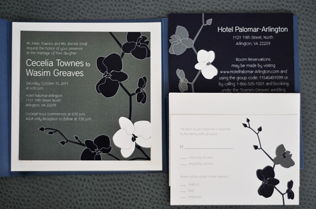 Their invitations used the cobalt blue, smokey grey, and white color palette. so modern!
