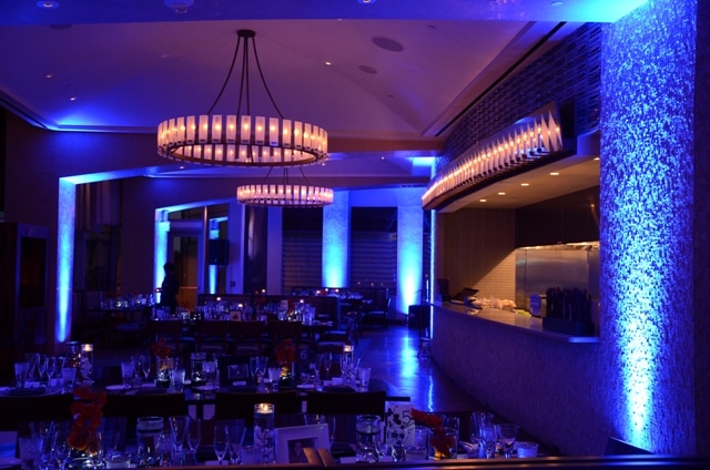 Again – 100% modern & keeping with the ultra cool color scheme, metallic grey chargers, blue napkins and hints of blue lighting at the reception decor.