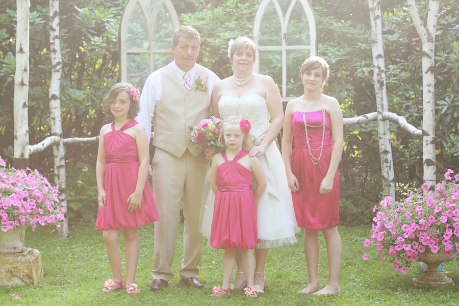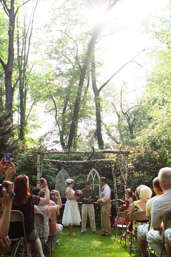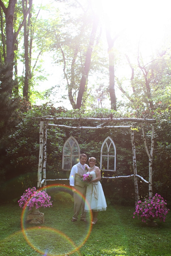 The ceremony was held in the gardens surrounded by rhododendron bushes. The alter was built by the couple and was rustic and gorgeous, made out of trees and vintage church windows. A reception directly followed the ceremony, being held in a different part of the gardens.