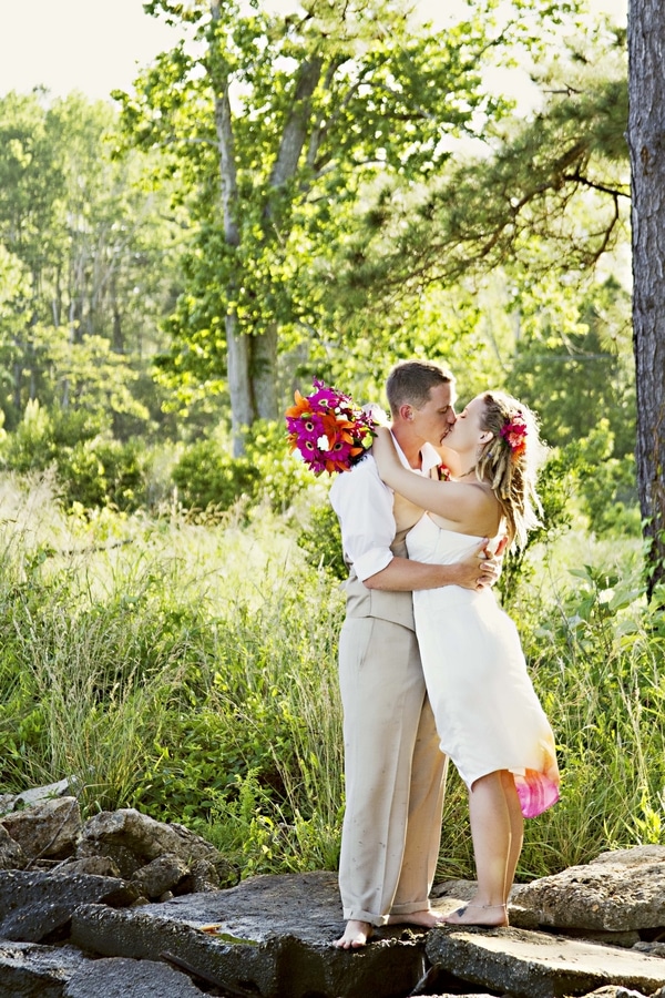 I shared a sneak peak on my Facebook wall yesterday of today’s offbeat wedding inspiration post. But the shot really didn’t do this amazing, 100% DIY wedding justice. The couple opted for a laid-back, backyard wedding – but they did not hold back on amazing, handmade details. The bright orange and hot-pink color scheme has me reeling, especially with the inclusion of the colors in the bride’s handmade dress.
