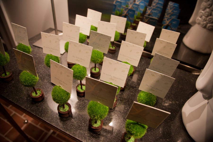 The couple wanted a Whimsical Forest theme for their wedding and to encapture that idea, Natasha filled the wedding design with eclectic, magical touches. She brought in elements of natural wood for the gift table, topiary tree escort card holders, cascading white and green flower arrangements (including hanging green amaranthus) on the reception dinner tables, table numbers with pictures of peacocks that Natasha took in New Mexico and place cards showcasing exotic trees from different countries.