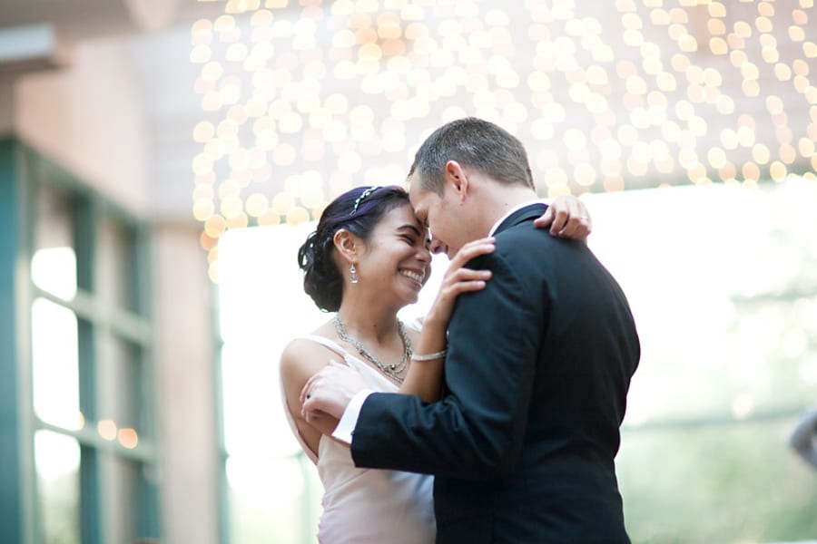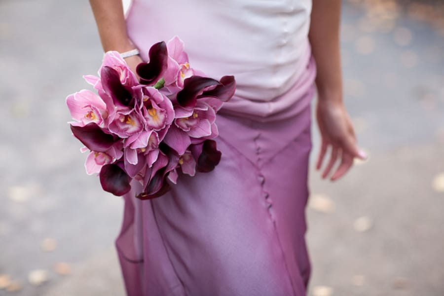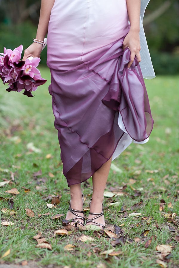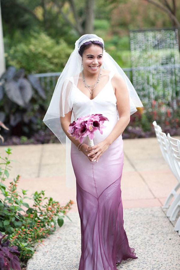The dress is the bride’s own design,  in collaboration with a local seamstress, Angie Caballero.  It was inspired by ombré fabric she happened to find during a trip to fashion week,  combined with visions of Gwen Stefani’s pink ombre wedding dress.