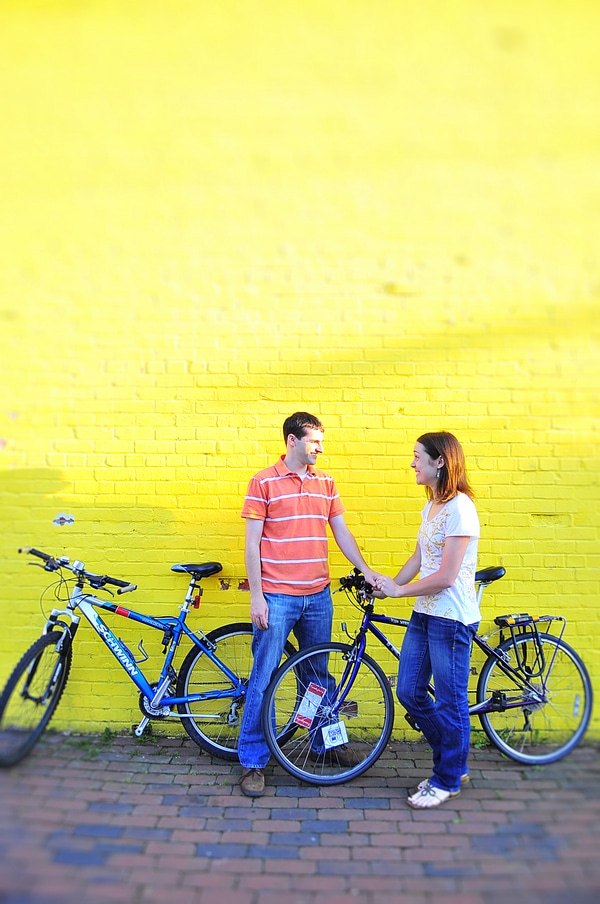 Gretchen and Tom wanted a bicycle-riding-ice-cream-eating engagement session. We went over to Old Town Alexandria, and walked around the area a bit. They went to Ben & Jerry’s for some ice cream, and then they rode the bikes. The yellow brick wall over at Chadwick’s was the perfect background for some portraits. I love the way these came out.