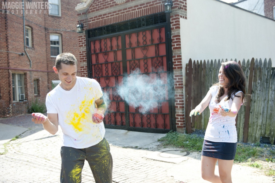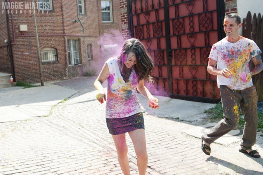 Andrew & Katie’s Offbeat Brightly Colored Powder Fight Anniversary Shoot
