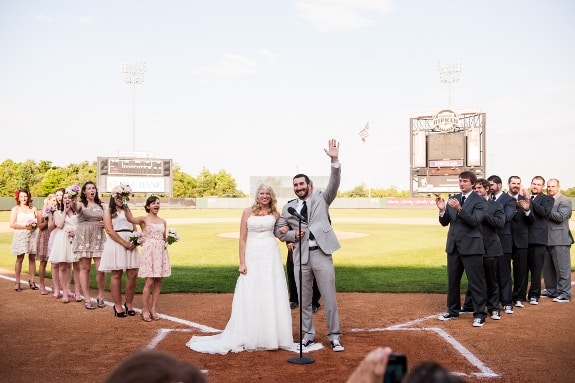 During the ceremony our guests sat in the stands and the pastor (my stepdad) stood at home plate. He then called in the groomsmen (who were in the dugout) and they each ran up to line up on the first base line.
