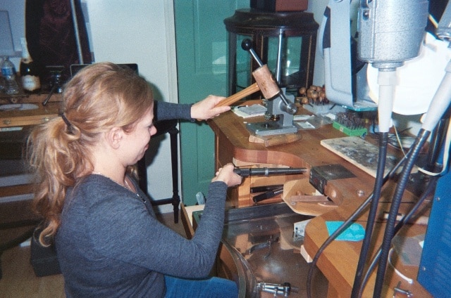 Some suggestions… If you are looking for a very detailed band, I would not suggest making your own band.  Some detail work can be done, but the jewelsmith will have to do the more intricate work, meaning you will actually work on it less.   If you would like stones in the band, you can not set them yourself, they send the ring to a professional to take care of that.  Ladies- make sure you wear your hair up so it does not get in the way!