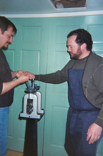 Chris and I made our wedding bands on a very cold January Monday morning in Warrenton, Virginia.  We arrived at 9 am eager and anxious.  Christopher was our jewelsmith, and he was extremely knowledgeable and patient.  We discussed and drew designs until everyone was comfortable with moving forward.  Then he presented us with the block of palladium.  It was one solid block that looked like a Lego.  Christopher measured the the block and we cut it into two pieces.  I made Chris’ ring and he made mine.