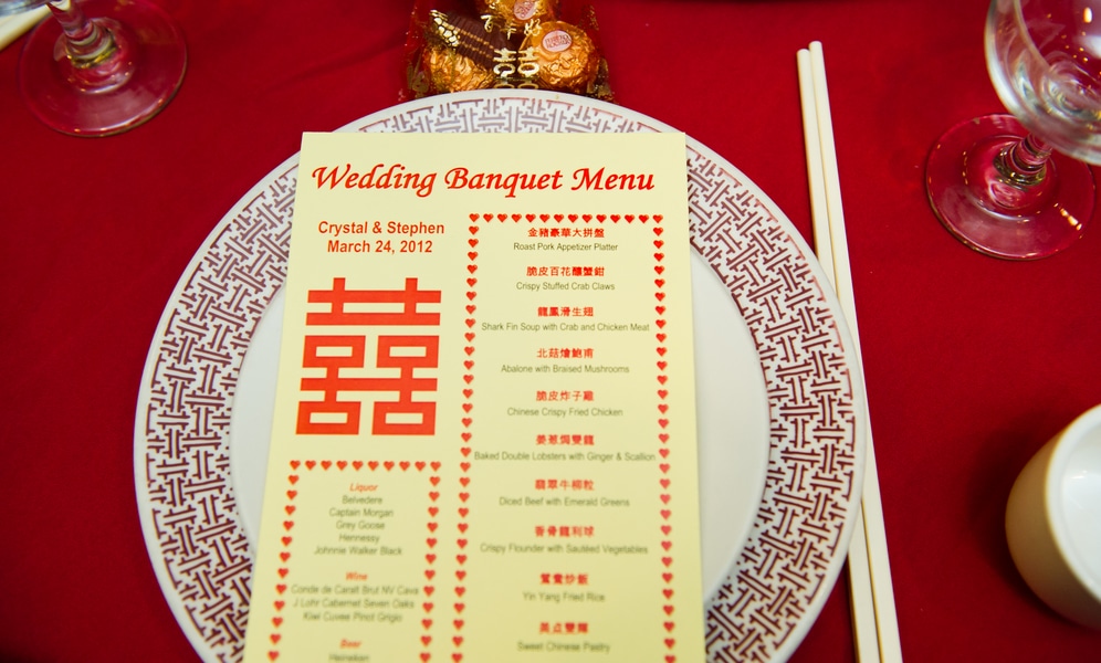 Crystal changed into her Chinese Red Dress and Stephen into traditional Chinese men’s fashion. They performed a tea ceremony honoring their family while guests dined at dinner.
