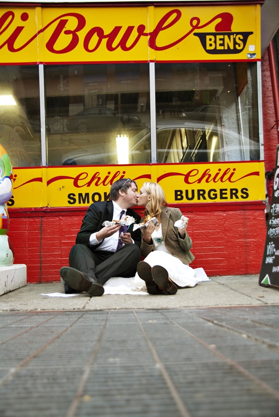 Anyway, the couple decided to jump back into their wedding attire for a fun jaunt around Washington, DC. They hit up Ben’s Chili Bowl on U for some half smokes and then got into more of the ‘trashing’ of the dress in Meridian Hill Park. I always love hearing the bride or couple’s response to why they chose to do this sort of shoot. Bayside Bride has a great post on the “Trash the Dress” debate if you want to weigh in!