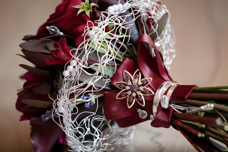 Deciding on my flowers was harder than planning my shop’s weddings…too many choices! I found my dress and it complimented the vintage theme, and I decided on deep reds, maroons, and purples with silver accents for the flowers. The antique brooch on my bouquet is my late grandmother’s, and was a gift from my cousin on the day of my wedding.