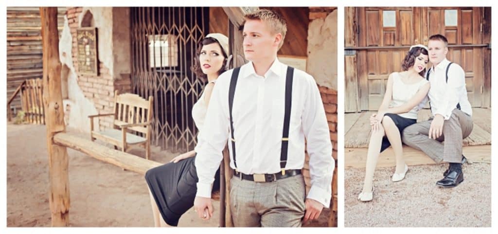 For today’s Inspiration Friday post, we have an awesome Bonnie & Clyde themed engagement session that was shot by Le Boudoir Studio & submitted via Two Bright Lights. I really love the styling of this shoot – it looks more like a movie set than an engagement session! The couple is gorgeous and the Arizona ghost town was the perfect setting.