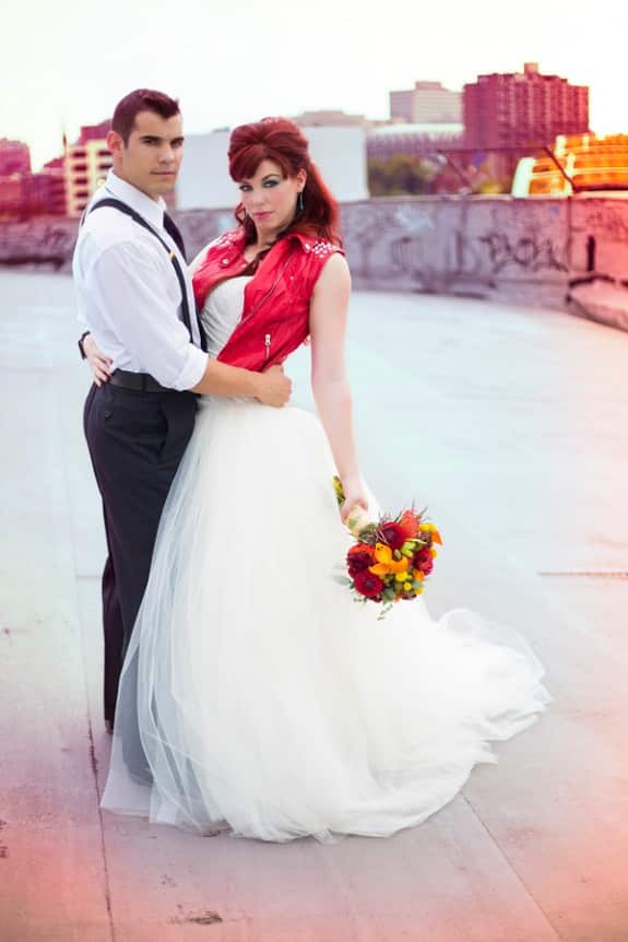 A bride with bright red, flowing hair, a red leather vest, a groom in suspenders, and a location called Graffiti Warehouse – I mean seriously, what more could I ask for in a feature?!