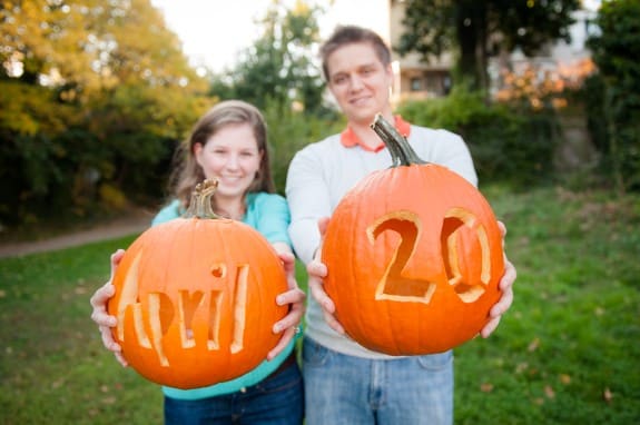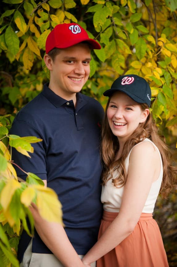 Our shoot was in Old Town, Alexandria. It’s where we first met and where we love to hang out. It will also be where we live in our first home after we’re married! Since the engagement session was in fall, we wanted to incorporate pumpkins. We love carving pumpkins and like to have a little competition every year with our jack-o-lanterns. Also, since we spend the majority of our summers watching the Nats play, we knew we had to include some curly W pride too!