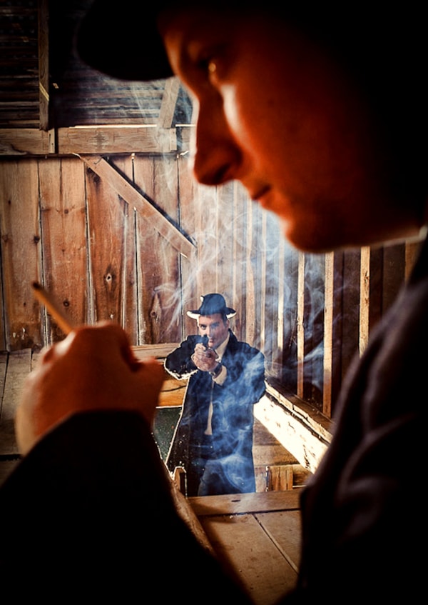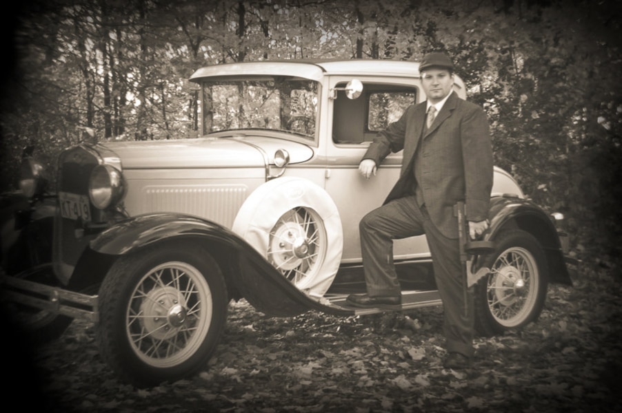 Tim and Giscelle knew they didn’t want any normal engagement session, they wanted something alittle different. Something that will involve their interest in old movies, Love for the 1930?s and each other. After seeing some of my artwork from the Tales of Lungenburgh series, they knew right away that was what they wanted, and we went right into production mode – creating a story board, gathering props, scouting locations, renting period Clothing and a real 1931 Ford Model A coupe. The Day of the Shoot was a beautiful one, and we took full advantage and photographed into the evening as well.
