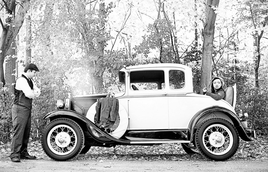 For today’s Capitol Inspiration, wedding inspiration feature, we have a super offbeat and FUN 1930s inspired shoot, including props, period clothing, a real 1931 Ford Model A Coupe and some “Bonnie & Clyde’ inspired crime shots. These pictures are just WAY too much fun – and they all look like movie posters, it’s so cool! A special thanks to Two Tone Studios & Two Bright Lights for making this feature possible!