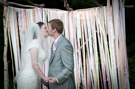 Elizabeth & Henry include a handful of personalized touches in their wedding day, and in order to keep within their small budget, they actually had the wedding on a Thursday! I think my favorite detail from their big day was the pastel ribbon backdrop to their ceremony. Beautiful (and perfect for spring wedding inspiration!).