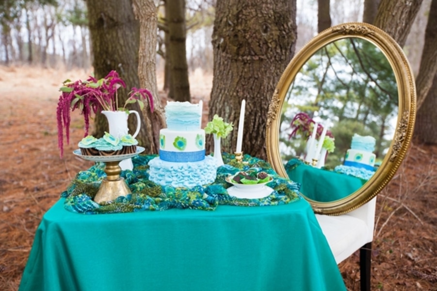I love the peacock inspiration, you did a really nice job of incorporating the teals, blue. I love the gold mirror on the chair next to that fabulous cake table. Looking forward to seeing more of your work.