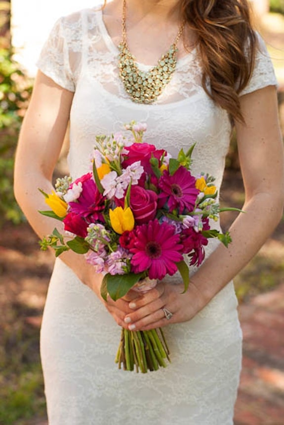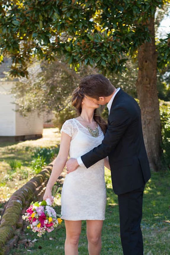 Bride’s attire: The bride’s lace dress was $10 at Marshalls. Accessories were borrowed from a friend.