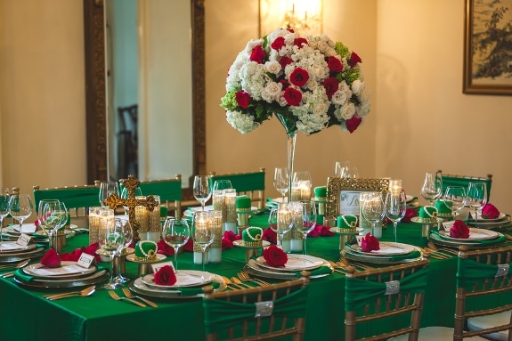 [Our] styled shoot in Savannah GA was at a 19th century Italianate mansion. We chose Emerald green and gold for the colors for accents and clothing.  We had 10 different higher-end vendors collaborate on this vision for the shoot, and it was powerfully done, just like Gatsby.