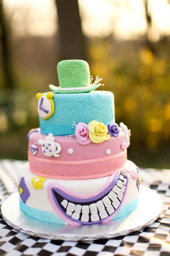 But, I couldn’t leave you all empty handed! So I have some fun shots from an Alice in Wonderland inspired wedding shoot – specifically the Mad Hatter’s tea party! Though the shoot includes a bride – I think you could use a lot of these fun (and easily recreatable details) for a bridal shower or other sort of event! I really love the bold checkered linen on the dessert table, the hand-painted paper products (check out that invitation! it’s AWESOME), and the cake is just TOO awesome to even describe!
