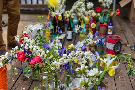 The summer we got engaged, we rallied all our family and friends to save beer bottles, tin cans, and mason jars for our centerpieces. We spray painted them on our patio for months until we collected over 100 pieces.