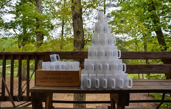 Because we had a keg station for drinks, we knew we’d need tons of cups for beer. Marko had the idea to order custom made cups for guests to not only use for the beer but to also work as wedding favors. We worked together to design something that fit our wedding theme and came up with a design of birch trees (since our location was outdoors/rustic) with our initials and wedding date “carved” inside a heart.