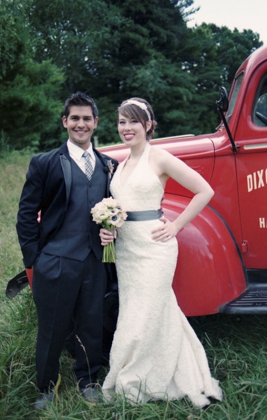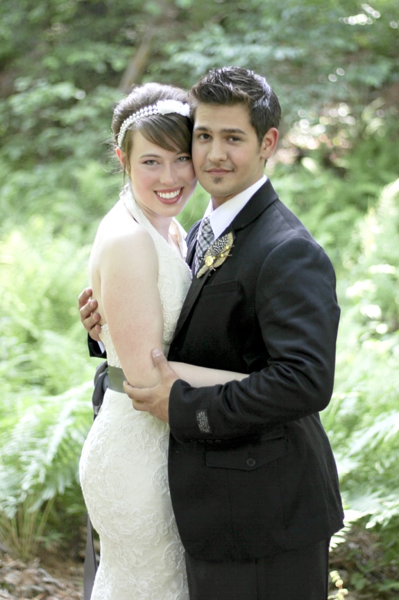 Though I knew from the beginning I was tired of strapless and didn’t want that, it took me trying on about 25 dresses before I realized I wanted classic all-over lace. I found it in an off-the-rack Tara Keely halter that had modern lines but was still delicate in design and easy on the budget. I added a charcoal satin sash as an accent and to compliment my dark-centered anemone bouquet. In addition, I wore some old gold earrings with pearls in the middle, which is reminiscent of her since her name was Pearl.