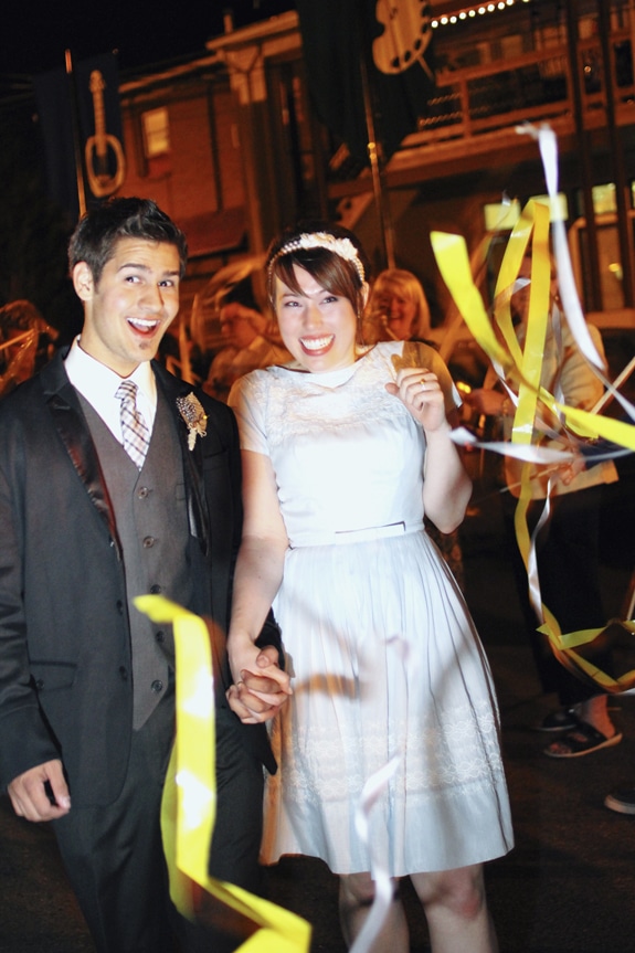 “We use the term “yellow” to describe how we feel when we’re together – relaxed, golden, happy – and so it was the basis for our wedding colors (as well as the color of my engagement ring!). The wedding ended up being a beautiful mesh of mine and Nelson’s personalities – Nelson’s charcoal modernism and my sweet, sunny vintage with weathered industrial to hold it together.”