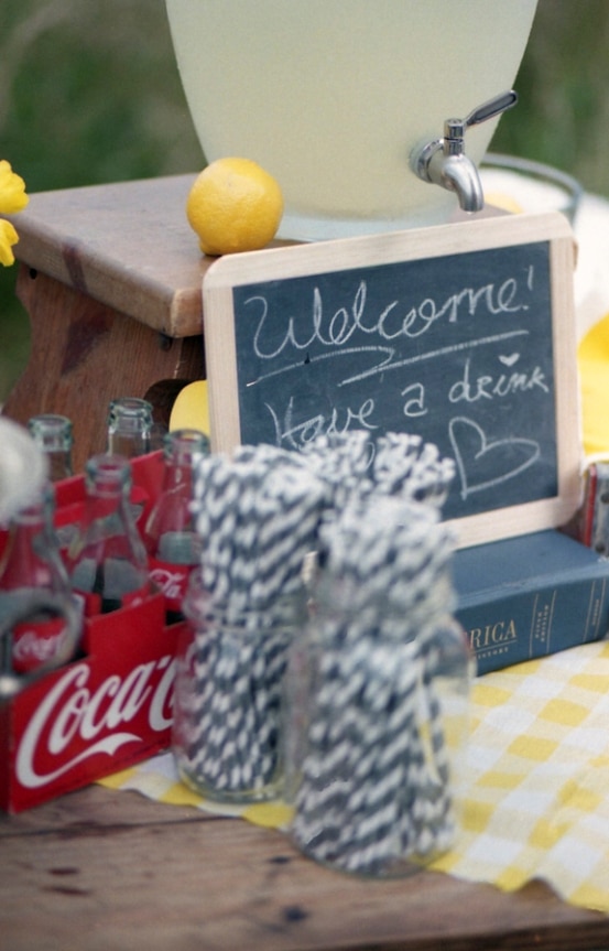 The doors opened to a kind of “outdoor chapel” with benches borrowed from local country churches. We wanted to keep everything fun and casual and give our guests traveling long distances time to relax before the ceremony, so everyone enjoyed mingling and my mama’s mint lemonade at the lemonade stand just before everything started.