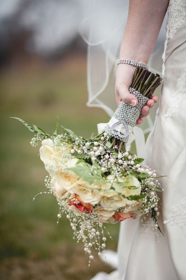 Jennifer’s aunt sewed crystals, family heirlooms from a great great great aunt, onto her bridal gown, which Jennifer found at TLC Bridal Boutique. Jennifer made the beautiful jewelry worn by herself, her bridesmaids and her daughter.
