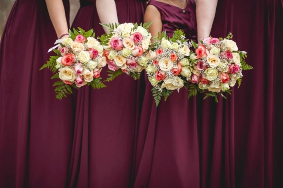 Her mother crafted the bouquets for Jennifer and her maids — bright roses, which complimented the rich purple color theme — as well as the men’s boutonnieres and the reception centerpieces.
