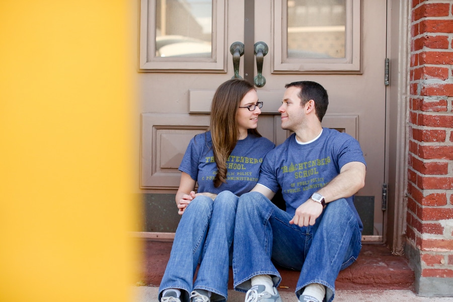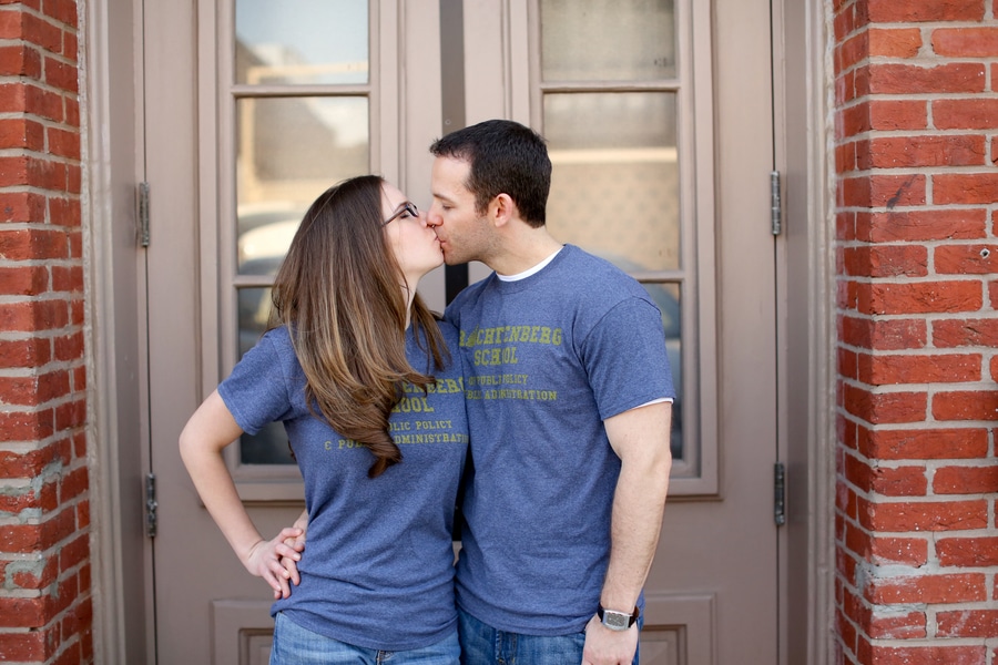 Stephanie & Kyle’s love story is quintessential DC – they met at their graduate studies at GW! I love the backdrop of Eastern Market in their engagement pictures and how they ended with their favorite t-shirts in their own neighborhood. Check it all out – including a shot of Stephanie’s gorgeous engagement ring AND their proposal story!