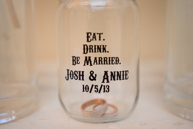 The pinwheels. All together I think 8 different friends helped make them and it probably took more than 20 hours. And they looked so cool. The ball jars were designed by the bride and served as the glass for the evening. The Rings were made by local artist David Vanover, who we found on Etsy. He incorporated metal from several family heirlooms.