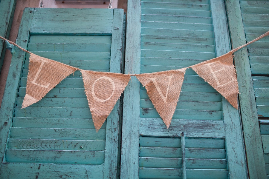 I hand made most of the decorations to match the invitation design, “Love Story,” I designed on www.minted.com. I found an old dictionary at Goodwill and from a template made with an x-acto knife and a metal ruler I cut nearly a hundred pendants. Then I picked out five languages that represented our lives: Spanish, Hebrew, German, Italian, Greek and stenciled “Love” on the pendants, punched holes in the corners and hung them on jute cord. I also made more than a hundred feet of rag garland. I picked inexpensive fabric – burlap, drop cloth, flannel, in muted tones and cut it into strips. I added white lace and silk stripes and colored ribbon. After the wedding I donated the decorations to Amore Events so other brides could enjoy them.